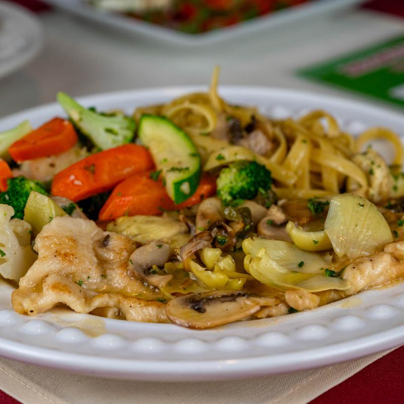 Boneless chicken breast pan-seared with white wine, lemon juice, capers, artichokes, served with assorted veggies and fettuccine pasta