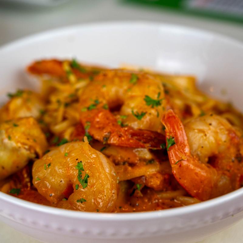 4 large shrimp, 4 large scallops, artichoke hearts pan seared with rose sauce and linguini pasta