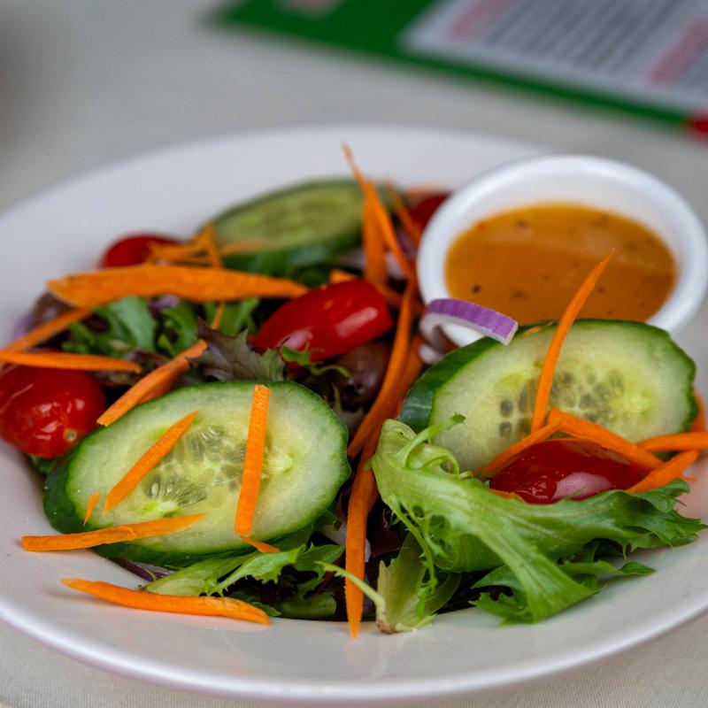 Fresh baby greens, cherry tomatoes, cucumber, red onions, shredded carrots, Kalamata olives, and a side of ranch or Italian vinaigrette