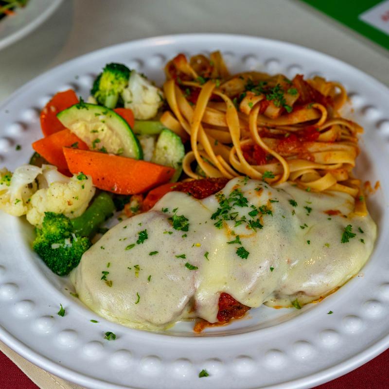 Lightly breaded chicken breast topped with provolone cheese served with fettuccine pasta and assorted veggies.