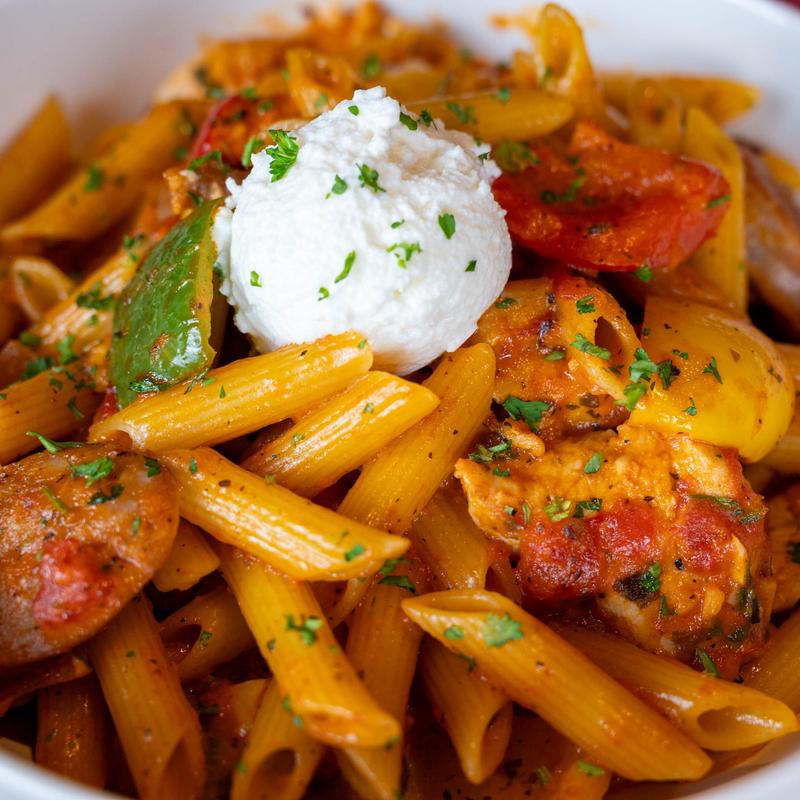 Fire-roasted peppers, grilled chicken julienne cut, red onions, Italian sausages, creamy rose sauce, tossed with ricotta cheese.